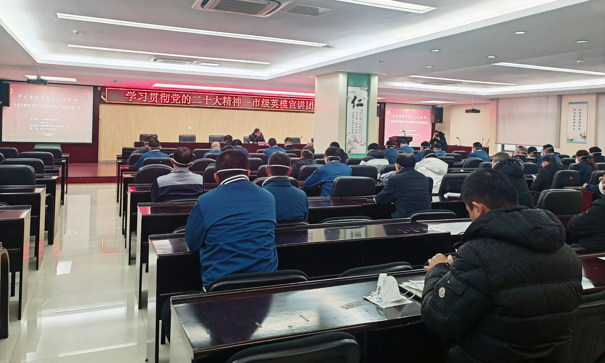 為深入學(xué)習(xí)宣傳貫徹黨的二十大精神,大力弘揚(yáng)勞模精神、勞動精神、工匠精神,推動黨的創(chuàng)新理論深入人心、落地生根,12月16日下午,由市委宣傳部、市總工會主辦、公司承辦的“學(xué)習(xí)貫徹黨的二十大精神--市級英模宣講團(tuán)走進(jìn)銅峰電子”宣講報告會在公司辦公樓二樓職教室舉行。會上邀請全國五一勞動獎?wù)芦@得者、銅陵金隆銅業(yè)公司技術(shù)主管盧鵬勞模作黨的二十大精神專題宣講。公司黨委書記、董事長黃明強(qiáng)等公司黨政領(lǐng)導(dǎo)班子成員參加宣講報告會,公司各黨支部書記、分工會主席和先進(jìn)模范、新黨員、入黨積極分子、群眾代表等聆聽了報告。宣講報告會由公司黨委副書記潘世宇主持。